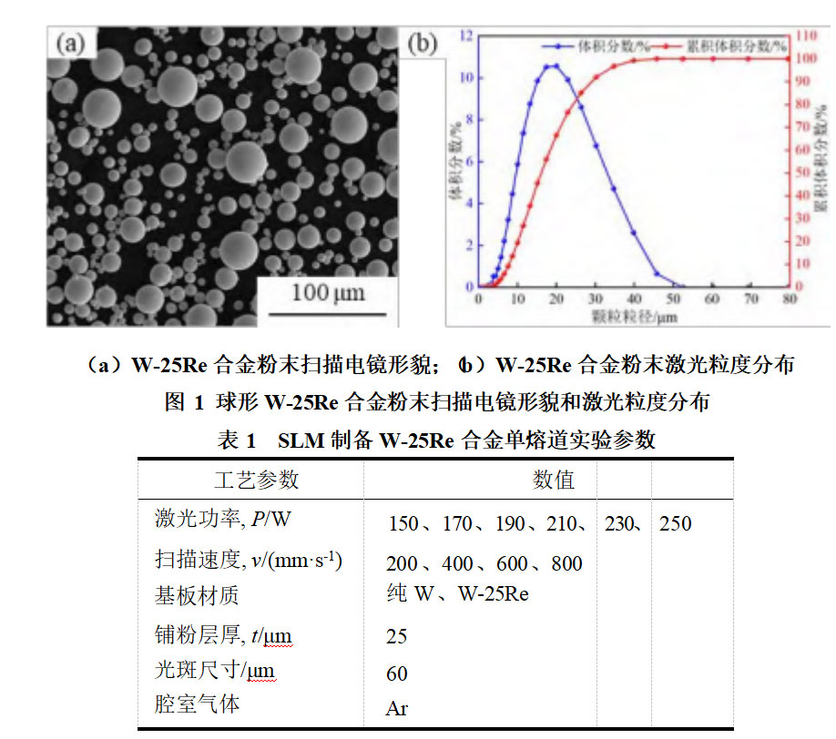 钨铼合金具有熔点高、高温强度高、抗辐射性能优异等性能,在电子、航空航天和军工等领域应用广泛[1-2]。随着选区激光熔化技术(selectivelasermelting,SLM)在工业领域的快速发展,采用SLM技术制备复杂结构钨铼合金零件成为研究热点[3-8]。SLM技术是由点、线、面到体逐层累积的材料成形工艺,其成形过程具有复杂的快速加热和凝固的特点[9-11]。单熔道是组成SLM制备零件的基本单元,其特征直接影响下一层的铺粉过程和成形质量,对最终零件的性能也有显著影响[12]。因此,在SLM制备零件过程中,科研人员常常先开展单熔道成形的研究,初步实现成形工艺参数窗口的探索,随后再进行零件的制备。此外,SLM制备具有内流道、薄壁、曲面、多孔等复杂结构零件,其零件尺寸精度很大程度上也取决于单熔道的成形质量[13]。因此,开展单熔道成形的研究是获取SLM制备零件工艺参数窗口的有效途径,这对于制备高质量零件具有重要意义。