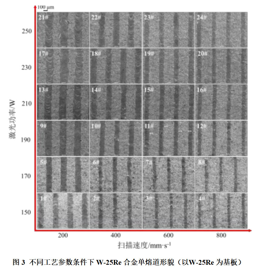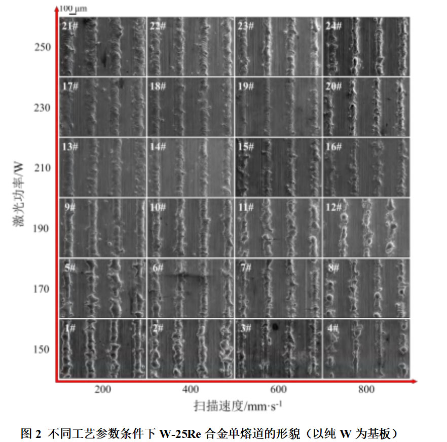 围绕激光功率、扫描速度和基板材质等工艺参数对SLM成形W-25Re合金单熔道成形质量的影响开展研究,分析W-25Re合金单熔道的表面形貌和几何尺寸,以期探索SLM成形W-25Re合金单熔道的工艺参数窗口,为后续制备高质量的W-25Re合金零件提供参考。