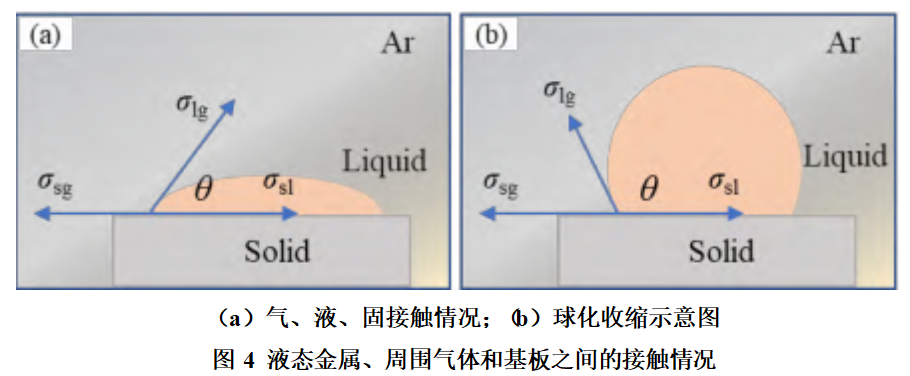 球化现象是SLM制备成形件中的常见缺陷,这除了与成形中液滴飞溅相关外,也与液态金属与基板的润湿性有关[23]。润湿性是液体在固体表面铺展的能力,当固-液-气三相界面张力平衡时,润湿方程为[24],