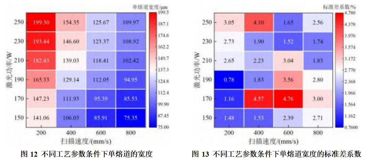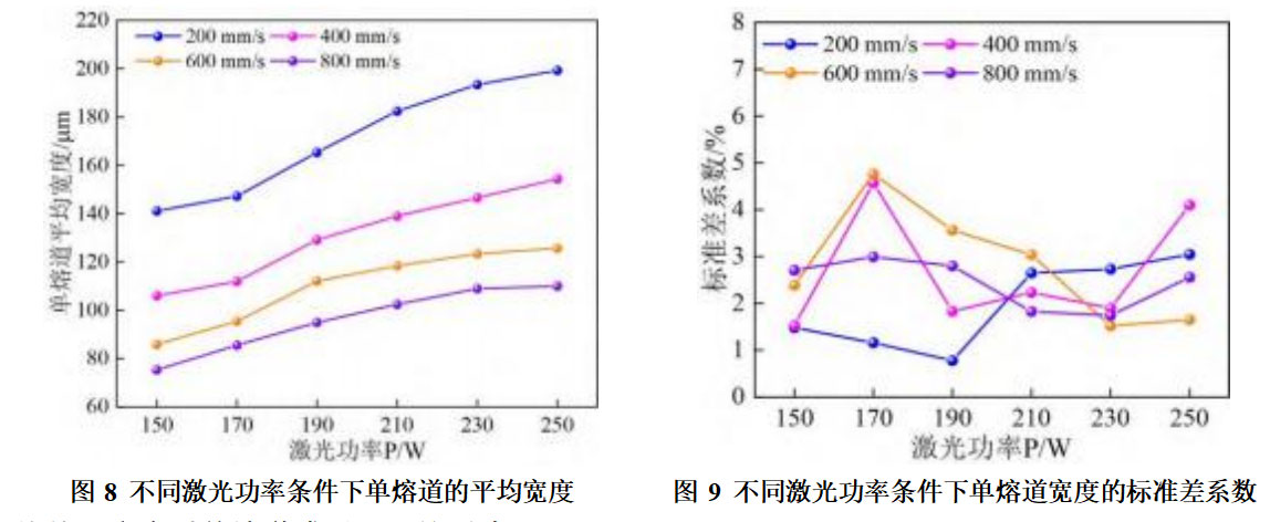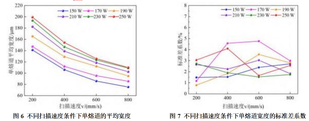因此,根据单熔道宽度y与线能量密度x的关系和标准差系数,可以预测单熔道的宽度及稳定性,这对于实际实验工艺参数窗口的筛选具有指导意义。