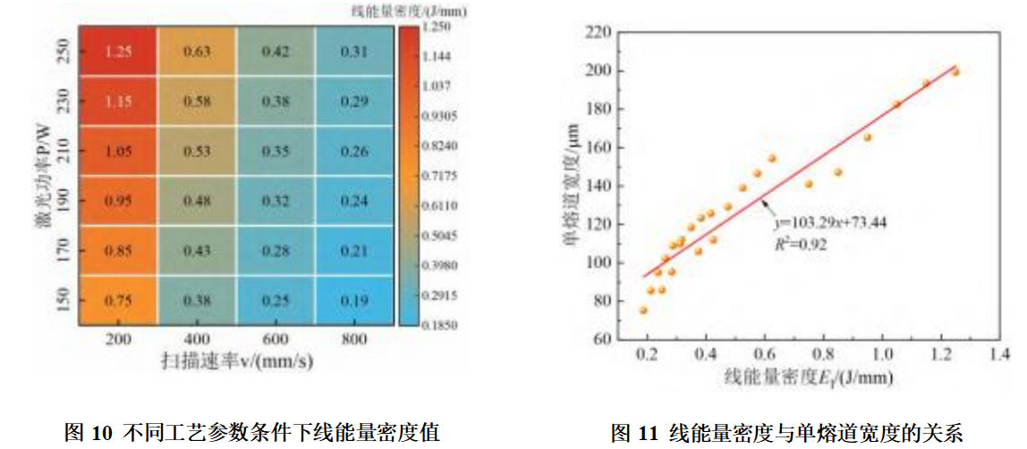 图10为实验所选工艺参数对应线能量密度值的大小。将不同线能量密度条件下获得的单熔道宽度数值进行线性拟合,如图11所示,测试结果的数据点在拟合线的两侧均匀分布。单熔道宽度y与线能量密度x呈线较为明显的线性关系,两者之间的关系式为,
