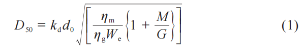 式中:kd为一个常数,范围为4×10-6~5×10-6;ηm(m2/s)和ηg(m2/s)为熔融金属和雾化气体的粘度;M(kg/s)和G(kg/s)为金属和气体的熔化流量质量;韦伯数可以通过We=U2ρmd0/γm计算,ρm(g/cm3)和γm(N/m)分别为熔融金属的密度和表面张力;d0为雾化盘喷嘴的直径;U为气体/液体相对速度[17]。根据粉末平均粒度计算式(1)可知,随着加热功率升高,感应棒料熔化的溶液温度升高,ηm熔融金属黏度降低,与粉末平均粒度D50成正比;当熔融金属黏度降低,金属熔化流量质量M增加,与粉末平均粒度D50成反比;所以随着加热功率增加,粉末平均粒度先下降后增加。