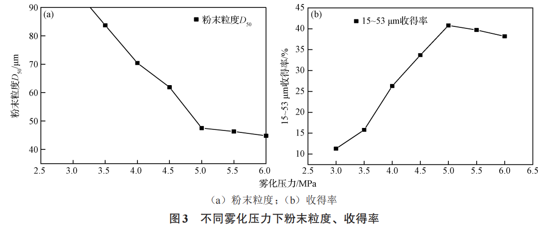 2.3 雾化压力对粉末粒度、收得率的影响
