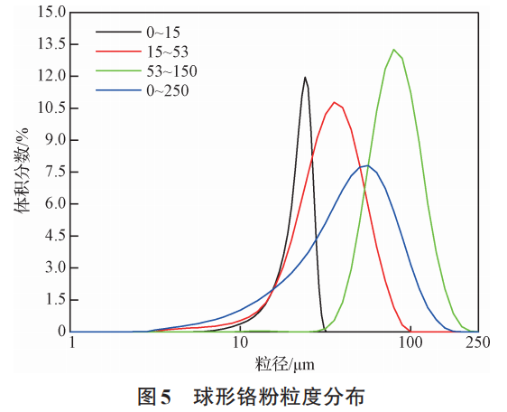 改进型电极感应气雾化制备的球形铬粉粒度分布见图5,分别为通粉0~250μm、筛分后得到的0~15、15~53、53~150μm的粒度分布,由图5可知,粉末粒度呈正态分布。