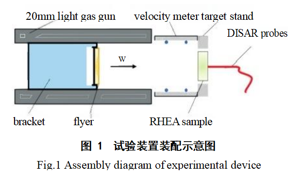 层裂试验基于20mm一级轻气炮平台进行,通过无氧铜飞片撞击TiZrNbHf难熔高熵合金靶板来完成层裂试验。平板撞击实验装置装配如图1所示。