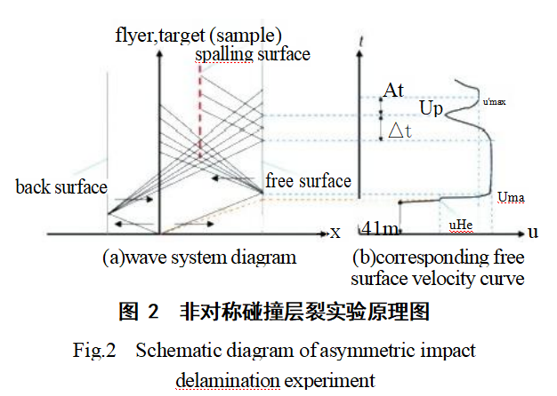 非对称碰撞层裂试验中,在如图2(a)所示的波系图中,飞片与试样靶板高速碰撞之后分别在靶板和飞片中产生右行和左行的冲击压缩波,冲击波到达靶架自由面和飞片后界面反射产生相向运动的稀疏波,并在样品内部产生交汇区域。右行波在靶架自由面处反射,导致自由面速度从0增大至Umax,如图2(b)所示。相向而行的稀疏波在靶架内形成的交汇区域为形成的拉伸作用区。当拉伸应力超过了材料的抗拉强度时,试样内部产生裂纹,发生层裂现象,同时在试样内部产生新的自由面;与此同时已经传播过去的右行稀疏波使试样右端自由面速度降低,此后的部分拉伸波会被裂纹阻挡,再次反射的压缩波在试样端面反射导致自由面速度从up发生回跳。