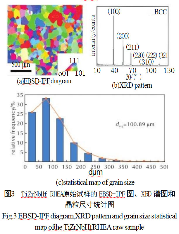 通过EBSD对原始试样进行分析,图3(a)为EBSD分析的反极图(Inverse pole figure,IPF),发现试样内部晶粒尺寸分布均匀,晶粒取向随机分布;图3(b)为XRD谱图,结果表明该合金为单相BCC结构;图3(c)为测试区域晶粒尺寸统计分布图,可以观察到晶粒尺寸主要集中在25~125μm之间,通过统计分析得到平均晶粒尺寸davg=100.89μm。