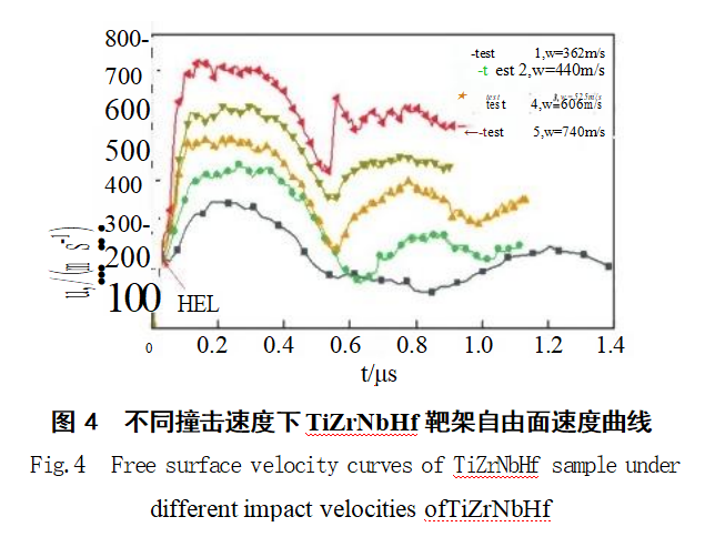 式中:0H为Hugoniot弹性极限;PRE为TiZrNbHf RHEA密度;CL为常态下合金纵波声速,CL=3841m/s,在室温298K下测得;UH为弹性波粒子速度;u为自由面上先行弹性波最大速度,即自由面速度历史曲线上拐点对应的速度,UH=1/2um。