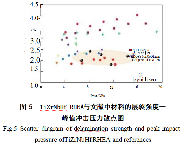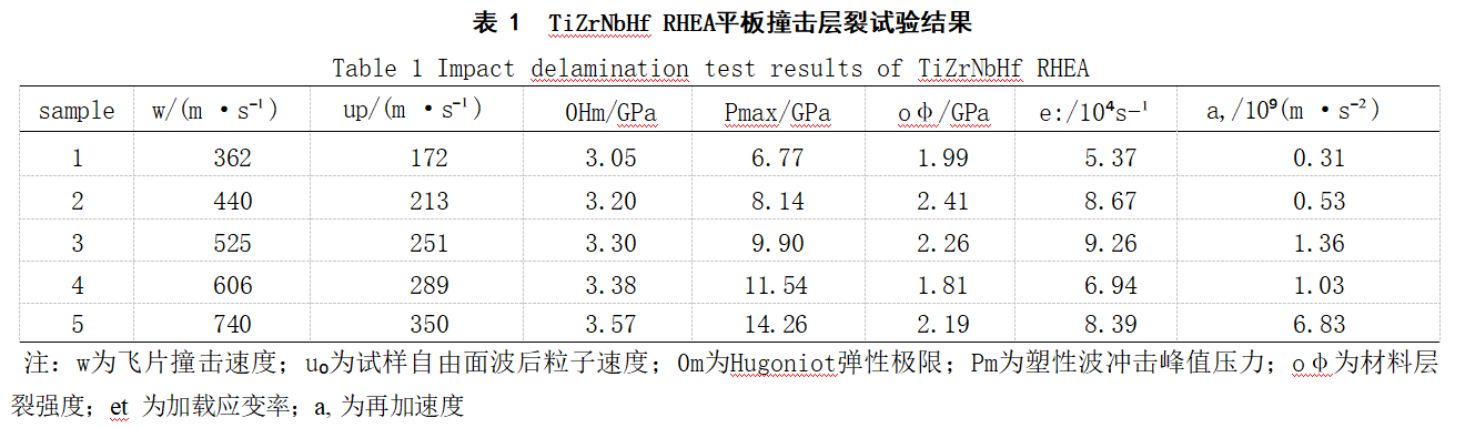 (1)采用平板撞击试验研究了不同冲击速度下TiZrNbHf RHEA的动态层裂特性,在塑性波冲击峰值压力范围为0~20GPa时,TiZrNbHf RHEA的层裂强度范围为1.81~2.41GPa。