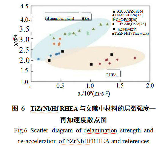 图6进一步说明难熔高熵合金的层裂强度普遍小于3D族高熵合金。再加速度a,反映了加载过程中的损伤率,较高的a,表明较高的空穴成核和聚结率以及较差的延展性。从图6可以观察到TiZrNbHf RHEA的层裂强度—再加速度散点较TiZrNbV21分布松散,其层裂强度稍大一些,也说明了其延展性比TiZrNbV RHEA[²¹好。