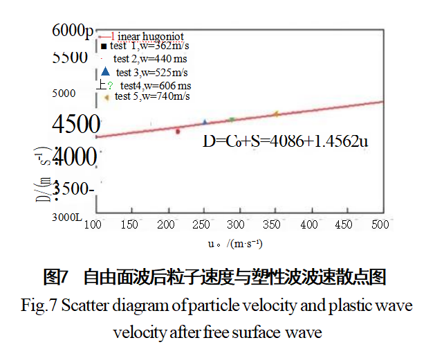 层裂试验的自由面波后粒子速度与塑性波波速散点图如图7所示,表现出线性Hugoniot关系,拟合得到冲击波波速D与自由面粒子速度up之间的关系,见下式: