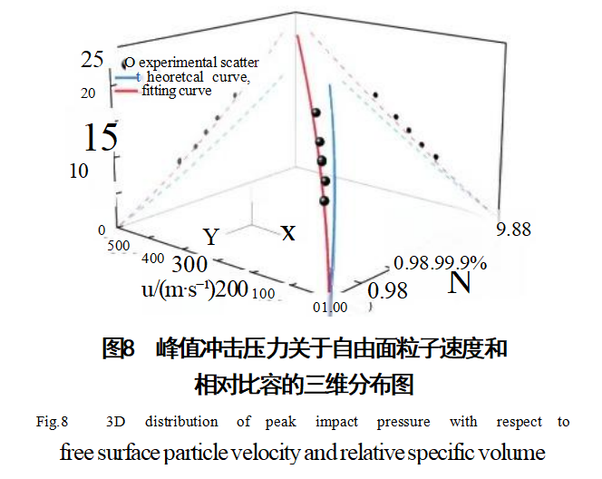 峰值冲击压力关于自由面粒子速度和相对比容的空间分布如图8所示,其中黑色球点为实验数据,红色曲线为基于实验数据的状态方程拟合曲线,蓝色曲线为基于冷能混合法的理论计算曲线。