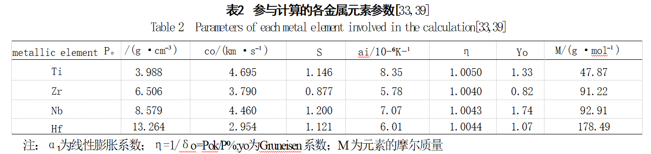 在理论计算时将TiZrNbHf RHEA视为由Ti、Zr、Nb、Hf4种元素组成的均相合金,基于上述公式和假设,合金的状态方程可通过下列步骤进行计算: