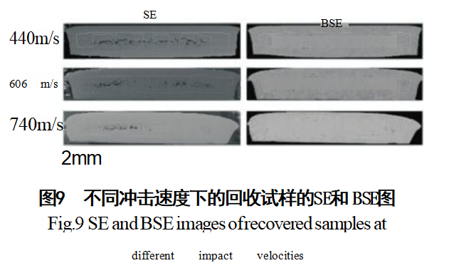 通过对3个冲击速度440、606、740m/s的回收试样做电镜扫描分析,不同冲击速度回收试样的SE和BSE结果如图9所示。