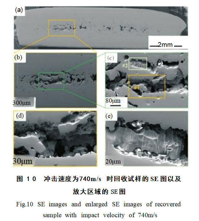 对740m/s冲击速度的回收试样做更细致的观察,结果如图10所示,可以发现孔洞相连,形成裂纹。