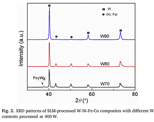 2) XRD谱表明,无论激光参数如何,SLM加工的W-Ni Fe-Co复合材料的主要相均为W和NiFe固溶体相。此外,随着Ni-Fe-Co含量的增加,W80和W70复合材料中出现了金属间化合物Fe7W6相。