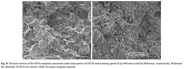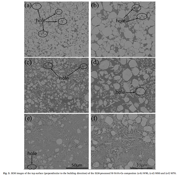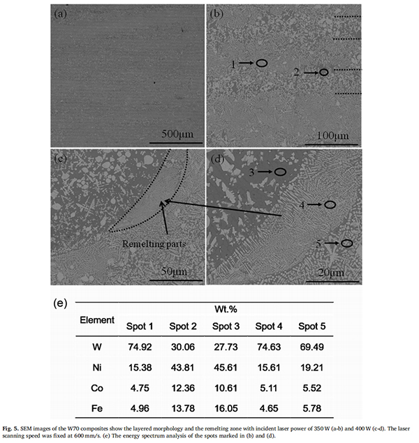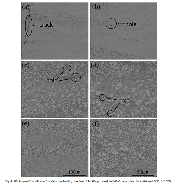 如图5(a-b)所示,W70合金的截面表面可见交替出现的层状细枝晶区和粗枝晶区。图 5(e)所示的元素含量表明,粗大的枝晶区由W颗粒和Ni-Fe-Co粘结相组成。当激光束照射混合粉末时,粉末吸收能量,温度迅速升高。大部分W颗粒完全熔化,熔池内形成温度梯度。在熔池上部,温度超过钨的熔点,导致W颗粒熔化。然而,在靠近固态成形部件的区域,部分W颗粒未熔化。Gurwell报道,由于SLM工艺过程中液相丰富,重力诱导的偏析也导致层底部W颗粒增多[[31]]。