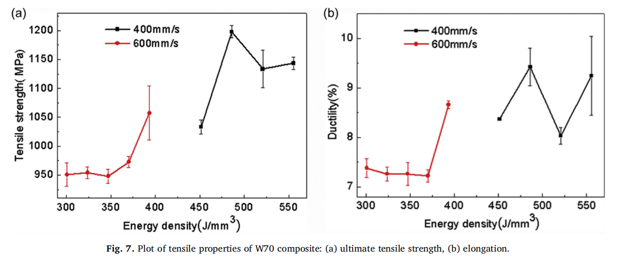 图7所示为不同激光功率和扫描速度加工W70复合材料的拉伸性能。扫描速度为600 mm/s时,W70复合材料的极限拉伸强度(UTS)随输入能量密度的增加单调增加,如图7(a)所示。能量密度为300 J/mm³时,UTS仅为950 MPa,而当能量密度增加到390 J/mm³时,UTS达到1060 MPa。如上所述,在激光功率为325 W、扫描速度为600 mm/s时,W70复合材料中存在未熔化的钨颗粒。 Ni-Fe-Co粘结相中较大的未熔钨颗粒和粗大晶粒导致拉伸强度相对较低。随着输入能量密度的增加,钨粉能够充分熔化并形成细小的枝晶,因此在能量密度为390 J/mm3(425 W和600 mm/s)时,拉伸强度显著提高。