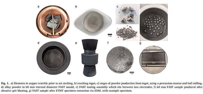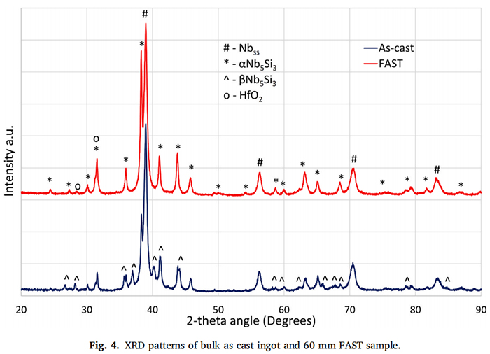 FAST 是一种有效的烧结方法,适用于多种粉末材料,包括金属和合金 [8,10]。与热等静压 (HIP) 相比,它能够烧结至非常高的密度,同时所需的温度和处理时间相对较短。这是由于同时施加热量和压力,并且升温速度较快。因此,FAST 是一种适用于从粉末中生产铌硅化物基合金的技术,并且已被证明能够生产出完全致密的材料,同时消除铸造缺陷并产生更细小的微观结构 [7,11,12]。