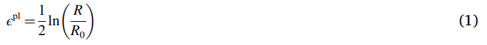 由于塑性应变是通过电阻测量的,因此电阻测量中的任何误差都会导致塑性应变的误差。电流和电压测量的不确定度优于 1/10⁻²,测得电阻的最大范围为 ±0.002 mΩ,标准差为 ±0.001 mΩ。根据公式 (1),塑性应变的塑性上限和下限为:εpl = 12 ln ( R±ΔRR0±ΔR0)。这用于估算约 0.05% 的塑性应变分辨率。