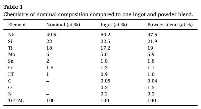 表1显示,名义成分、铸锭成分和粉末混合物的成分之间具有良好的一致性。在初始电弧熔炼试验中,汽化导致成分发生显著变化,因此使用不同量的某些元素进行了几次迭代,以使化学成分尽可能接近名义成分。尽管如此,铸锭的实际成分并不完全符合名义合金成分。这解释了铸锭成分和粉末混合物之间的差异,因为粉末混合物是多个组合铸锭的平均值。