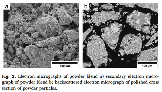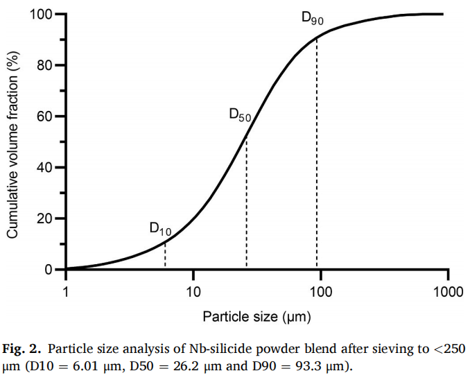 首先用冲击研钵将锭块粉碎。然后将粉碎的颗粒材料连同氧化锆研磨球一起放入一个装有氧化锆内衬的罐中,罐内装有通气盖,并用氩气冲洗以形成惰性气体环境。使用 Retsch PM100 行星球磨机在惰性条件下将材料研磨成粉末。将单个锭材的破碎和研磨粉末混合,制成单一粉末混合物。将粉末筛分至 <250 μm,并使用 Malvern Mastersizer 3000 激光衍射仪测量所得的粒度分布 (PSD)。
