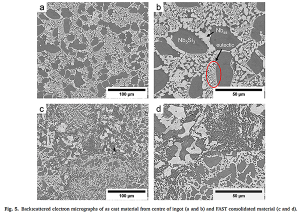 利用SEM和X-EDS研究了FAST处理后合金的微观结构,并与铸态锭进行了比较。铸态微观结构(图5a和b)从锭中心开始,由大面积的Nb5Si3区域组成,周围环绕着Nbss和Nb5Si3的混合物。存在一些由这两相组成的共晶区域,这些区域大多形成于Nb5Si3晶粒附近(见图5b)。这表明铸锭的凝固始于βNb5Si3作为初生相,随后形成Nbss,最后形成Nbss+βNb5Si3共晶。经过球磨和FAST固结后,微观结构发生了显著变化。FAST微观结构看起来更加均匀细腻,这与使用粉末的预期结果一致。较大的Nb5Si3区域在球磨过程中被分解,因此在FAST微观结构中尺寸要小得多。如图5d所示,微观结构中相的尺度和分布仍然存在一些差异,这是由于图3b中粉末颗粒之间的差异造成的。优化球磨工艺和/或筛分至更小的颗粒尺寸将进一步改善微观结构的均匀性。观察到一些孔隙,这在使用PM加工的材料中很常见,但通过研究一系列光学显微照片,测得孔隙率小于0.2%,因此预计不会对机械性能产生任何显著影响。