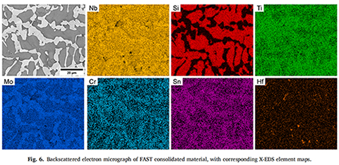 图6所示的X-EDS元素图突出显示了不同元素在微观结构中的偏析情况。正如预期的那样,Ti、Mo、Cr和Sn分布在Nb5Si3相中,而Si存在于Nb5Si3相中。在FAST材料中也观察到了第三相,X-EDS证实了Hf以HfO2形式富集在其中。