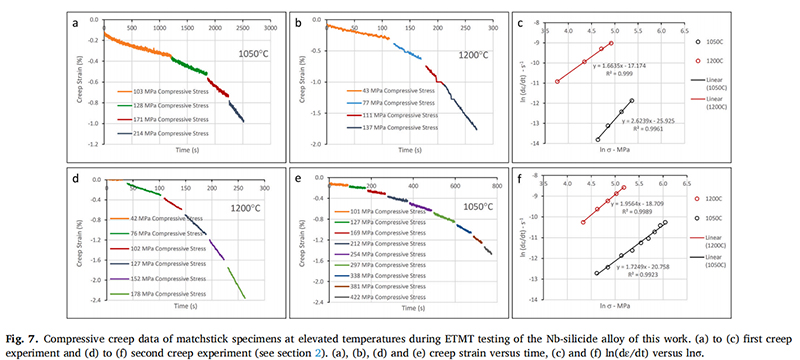 Nb5Si3 的应力指数 n 约为 1,Nb 和 Nbss 的应力指数更高 [18];Nb-10Si 和 Nb-16Si 二元合金的应力指数 n 介于 2.5 和 3 之间;Nb-Si-Ti-Hf 硅化物基合金的应力指数范围更广,约为 1.1 至 11 [40];MASC 和 MASC 基合金的应力指数 n 介于 2 至 6 之间(Nb-25Ti-16Si-8Hf-2Al-2Cr 合金(名义含量,at.%)被称为 MASC = 金属和硅化物复合材料);添加/不添加 Ti 和 RM(Mo、Ta、W)的 Nb 硅化物基合金的应力指数 n 介于 1.3 至 4.5 之间;对于单晶高温合金CMSX4 [41],其n值为4.35~6.35。上述数据来自在铸态(电弧熔炼或定向凝固)或热处理条件下进行蠕变试验且未使用ETMT进行蠕变测试的相和合金的压缩蠕变试验。