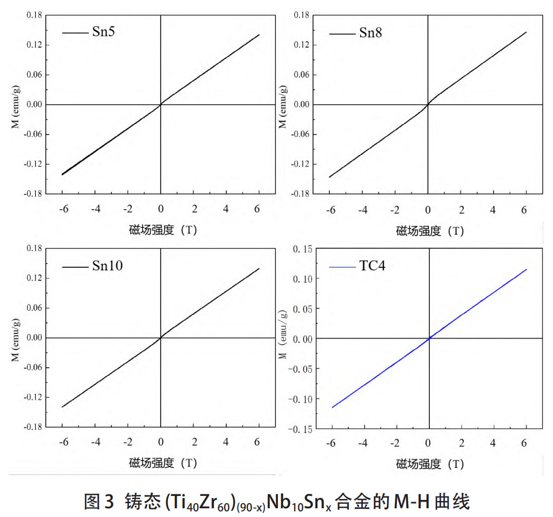 随着Sn元素含量的增加,实际质量和体积磁化率呈现先上升后下降的趋势,(TiZr)85Nb10Sn5合金拥有最小的质量磁化率和体积磁化率,分别为2.369×10-6cm3/g和181.89×10-6。